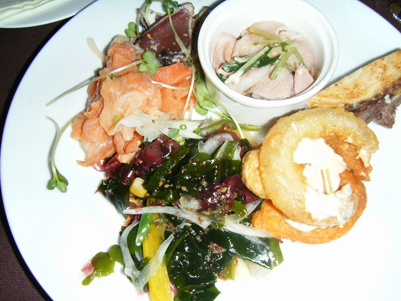 サーモンに、海草サラダ、ナゲット+オニオンリング+変なボールの3つに、